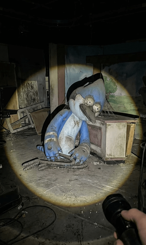 Use the uploaded image of the character as an exact reference. Preserve the original proportions, materials, colors, textures, and facial features. Do not alter the design and do not stylize the character. A first-person point-of-view shot inside an abandoned space [LOCATION TYPE: television studio / advertising set / real filming location]. The viewer is holding a flashlight, creating a single circular beam of light while the rest of the space is engulfed in darkness. In the flashlight beam, it is visible that the character is positioned as if it was left behind after filming: [POSITION: lying on the floor / curled up in a corner / leaning against a table / slumped against a wall]. The character must appear completely lifeless and inactive: no action, no intentional pose, no sense of presence. If it is a doll or a costume, there must be no visible hands, rods, strings, or person inside. The character appears old, dirty, and abandoned: worn fabric, accumulated